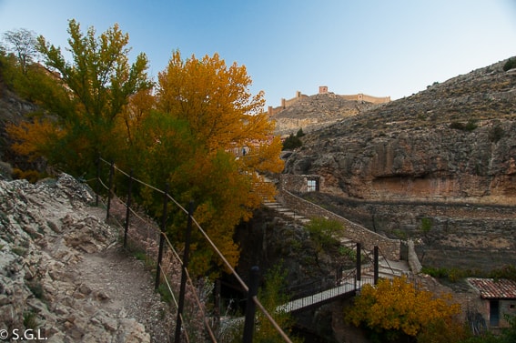 Y después de comer y antes de que se hiciera de noche, hicimos el paseo fluvial de Albarracín que bordea el pueblo siguiendo el cauce del río Guadalaviar. Es un paseo bastante cómodo, a excepción de una zona con unas pasarelas colgantes que dan al río y una zona un poco pedregosa. Para ir con carrito de niño o silla de ruedas, esa zona es bastante inaccesible. Si no tienes ese tipo de problemas es un paseo muy recomendable. Nosotros estuvimos en el puente de Todos los Santos y con los colores del otoño el paisaje era espectacular. Además de la vegetación, en una de las zonas se ve Albarracín al fondo, con su muralla, su castillo y su catedral. Unas vistas muy bonitas. Se tarda en hacerse algo menos de una hora. Nosotros comenzamos desde el portal del agua, en el centro de Albarracín y terminamos en la zona baja de la ciudad, ya directos a coger el coche. Lo cierto es que pasamos un día muy agradable visitando Albarracín, uno de los pueblos más bonitos de España.
